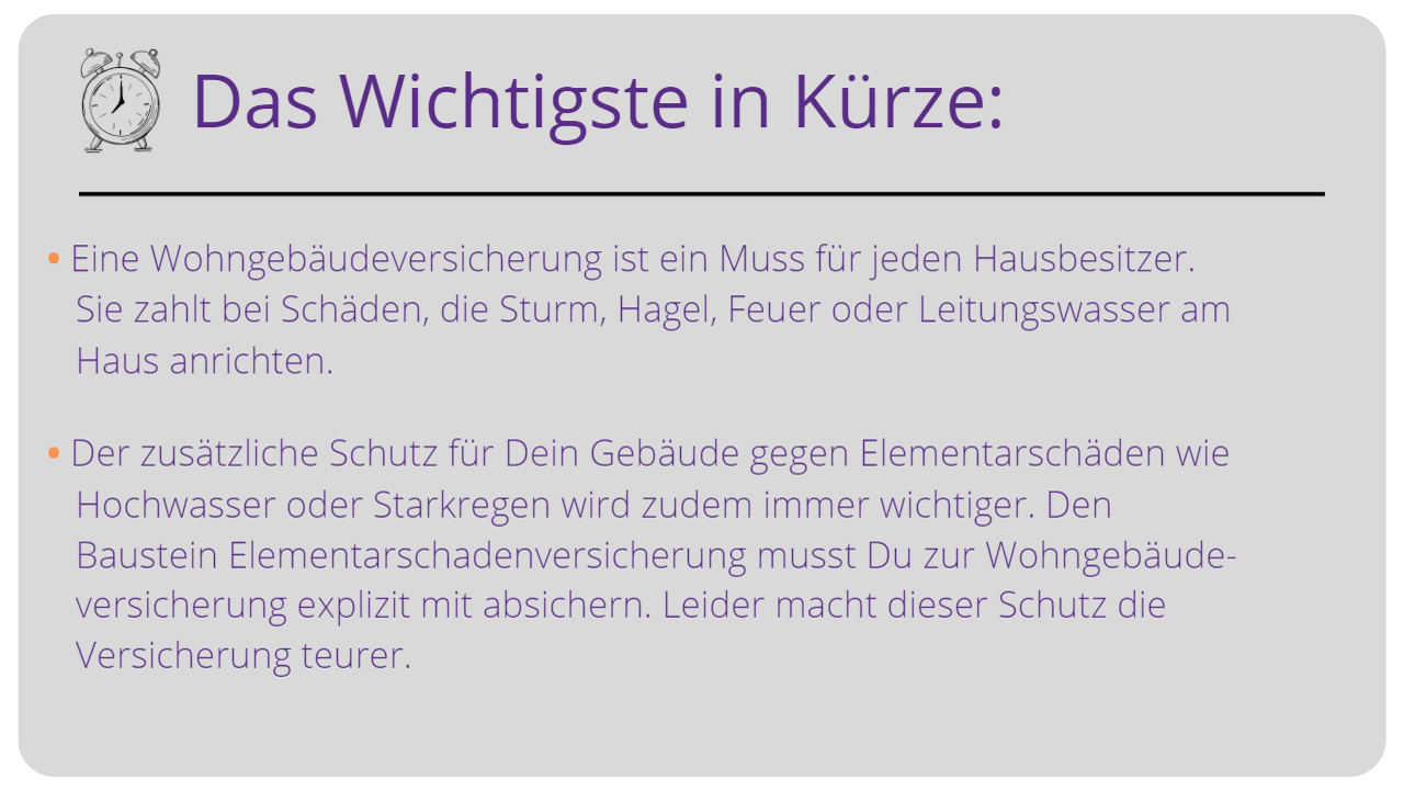 Eine Gebäudeversicherung zahlt alle Schäden an einer Immobilie, die durch Brand, ausgetretenem Leitungswasser, Sturm und Hagel entstehen. Grundsätzlich empfiehlt sich diese Versicherung für alle Eigentümer, da diese Risiken mit einem potenziell hohen Schaden einhergehen. Ein Feuer kann zum Beispiel einen Totalschaden verursachen. Die Gebäudeversicherung deckt aber nicht alle Gefahren ab. Wer sich gegen Hochwasser, Erdbeben und Starkregen versichern will, muss zusätzlich eine Elementarschadenversicherung abschließen.