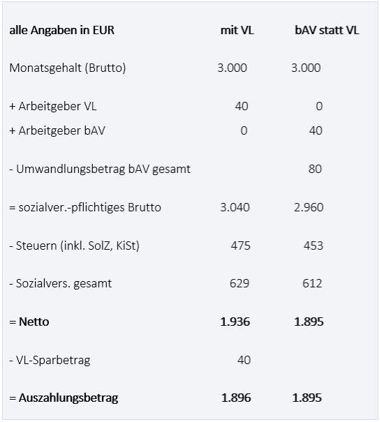 Wird der VL-Betrag in der betrieblichen Altersvorsorge angelegt, spart der Mitarbeiter erstens Steuern, zweitens entfallen für Sie und Ihre Arbeitnehmer die Sozialversicherungsabgaben auf den vollen Anlagebetrag.