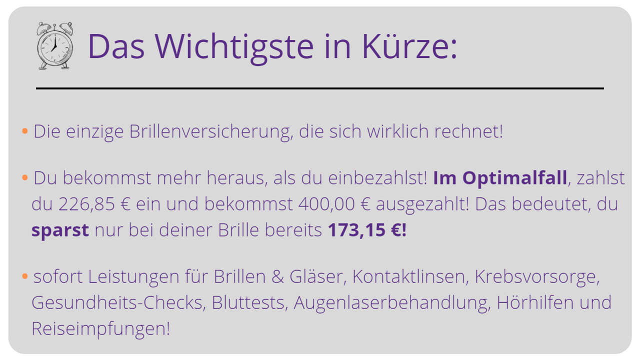 Es gibt jedoch eine Brillenversicherungen, die durchaus Sinn macht, nämlich dann, wenn du mehr herausbekommst, als du bezahlst!
