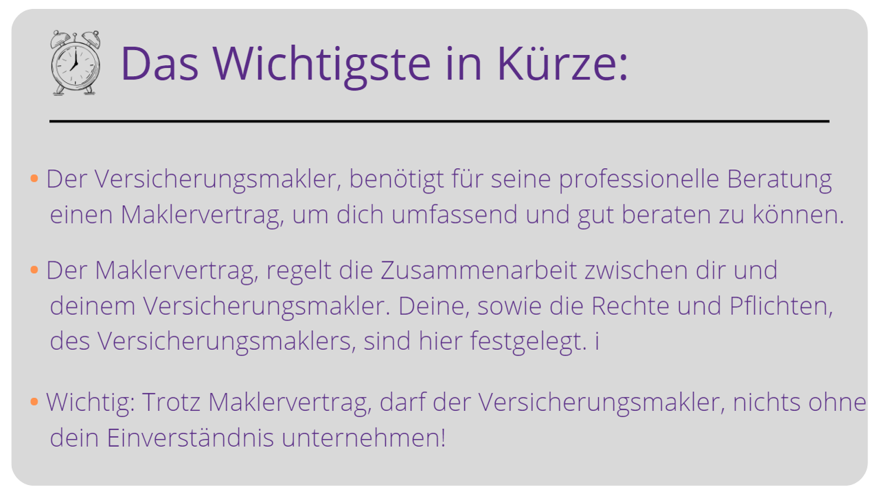 Durch einen Maklervertrag, gibst du jedoch nichts aus der Hand! Der Versicherungsmakler, darf nichts ohne dein Einverständnis unternehmen.