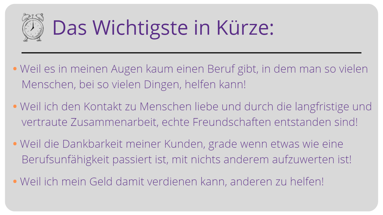 Es gibt für mich persönlich nichts schöneres, als unseren Kunden zu helfen sich besser und günstiger zu versichern, Probleme wie die Absicherung des Einkommens oder die Rentenproblematik zu lösen, - und hiermit auch noch Geld zu verdienen.